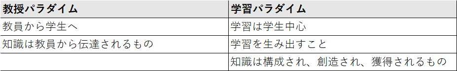 教授パラダイムは、「教員から学生へ」「知識は教員から伝達されるもの」を特徴とするのに対して、学習パラダイムは、「学習は学生中心」「学習を産み出すこと」「知識は構成され、創造され、獲得されるもの」を特徴とする(表1を参照)。