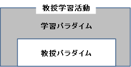 教授パラダイムから学習パラダイムへの転換を主唱したタグ(Tagg, 2003)自身が述べるように、教授学習の活動全体を見渡したとき、両パラダイムは決して二項対立の関係にあるものではない。教授パラダイムに基づき、講義で学生に知識を伝達する時間はあっていいし、その時間はこのパラダイム転換によって否定されてはいない。タグが「学習パラダイムは(教授学習の)活動の場を拡げ、教授パラダイムを越えたところに私たちを移動させるのである」(pp.37-38、カッコ内は筆者が挿入)と述べるように、学習パラダイムは教授パラダイムを基礎として、教授学習活動を豊かに拡張、発展させるものである(図1を参照)。