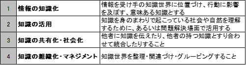 情報・知識リテラシーは、表5に示すように、「情報の知識化」「知識の活用」「知識の共有化・社会化」「知識の組織化・マネジメント」からなると考えられている。以下、簡単に説明しよう。
