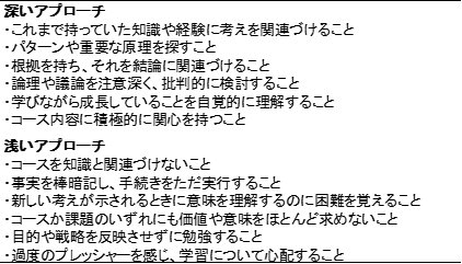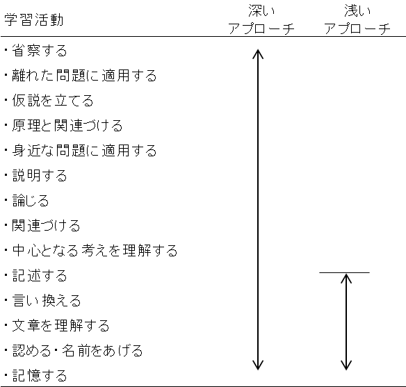 この表の秀逸なのは、深いアプローチが、決して浅いアプローチで問題となる動詞を用いないということではなく、表で示されるあらゆる動詞を用いて学習がおこなわれることを明示している点である。深いアプローチであろうとも、学習課題や状況によっては、「記憶する」「文章を理解する」「言い換える」といった動詞を用いて学習がおこなわれるのであって、その意味で、むしろ浅いアプローチが問題なのは、「省察する」「離れた問題に適用する」「仮説を立てる」「原理と関連づける」といった動詞を用いた、高次の認知機能を用いた学習が欠如していることにある(Biggs & Tang, 2011)。