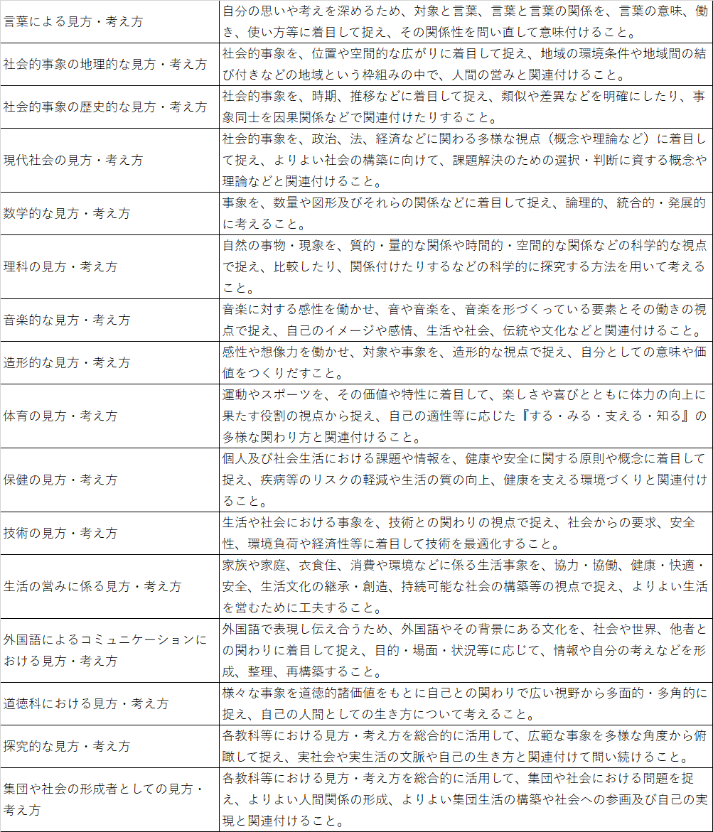 その上で、各教科の特質に応じた深い学びを、より具体的に「見方・考え方」として発展させる。学術的な深い学びは、各教科の特質まで考慮して説明されるものではないが、答申は学習指導要領の改訂と連動しているので、各教科の特質まで考慮し、初等中等教育課程の細部にしっかり対応するものとなっている。各教科の「見方・考え方」のイメージが、答申の別紙1に示されているので、表3としてここに示しておく。