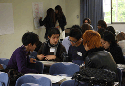 と元気よく応えてくれた。10分後このグループを見ると、男子学生はまたひとりぼっちになっていた。授業後話を聞くと、一度は訊いてくれたようだが、すぐ二人だけの議論に戻ってしまったようだ。留学生に訊くと、彼と話をしても反応が弱くて、おもしろくないらしい。2~3週間後この学生は授業に来なくなった。