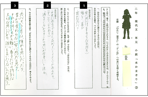 図表2は、静岡市立高等学校の川嶋一枝教諭の授業で用いられたワークシートである。[1]個のワークとして自分の考えを書く。それをもとにペアワークをおこない、そこで気づいたことを[2]でメモをする。授業の最後には、[3]にふり返りを書くという構造になっている。ワークシートをこのように構造化すると、自分の考えを[1]で必ず外化しなければならない。ペアワークをおこなった後には[2]で必ず気づきを書かなければならない。[3]のふり返りも然りである。