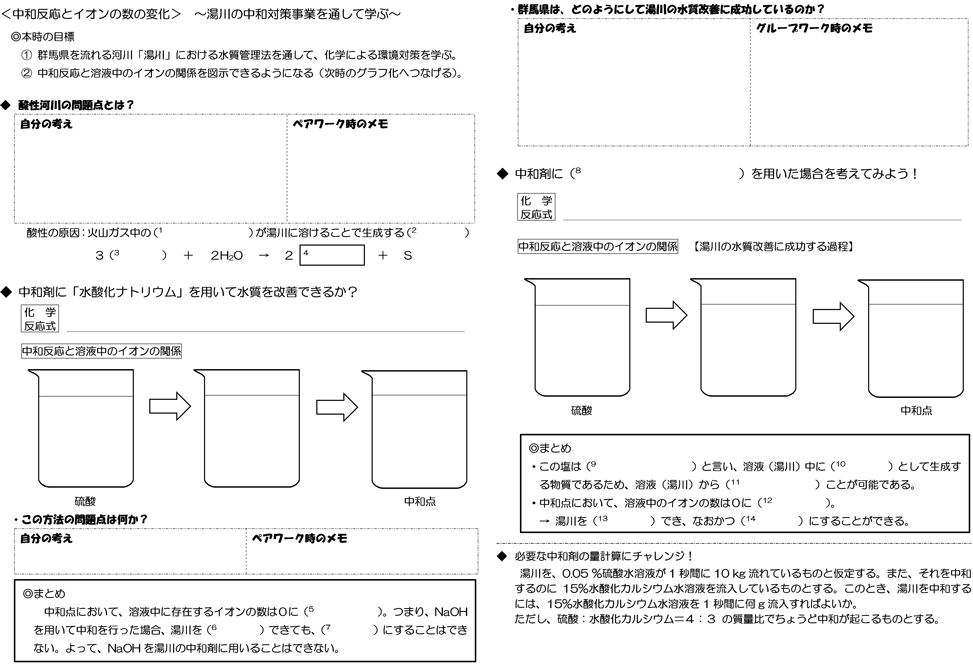 もう一例、長崎東中学校・高等学校の丸田修也教諭の授業で用いたワークシートを紹介しよう(図表3)。ワークシートには、「酸性河川の問題点とは?」「この方法の問題点は何か?」「群馬県は、どのようにして湯川の水質改善に成功しているのか?」と、この時間で扱われる3つの問いが与えられている。生徒は、それぞれの問いに対して「自分の考え」を出し、グループワークをしながら、あるいは終わってから「グループワーク時のメモ」に考えたことを書いていた。