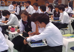 図表4 ワークシートに書いたものをもとに議論 *丸田修也教諭@(長崎県立)長崎東中学校・高等学校(理科 中学3年生)