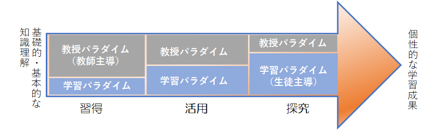 教授パラダイムか学習パラダイムかと二項対立的にとらえるのではなく、図表1のように、習得から活用・探究へと、教授パラダイムのウェイトが下がり、学習パラダイムのウェイトが上がっていくと捉えられるべきものである。