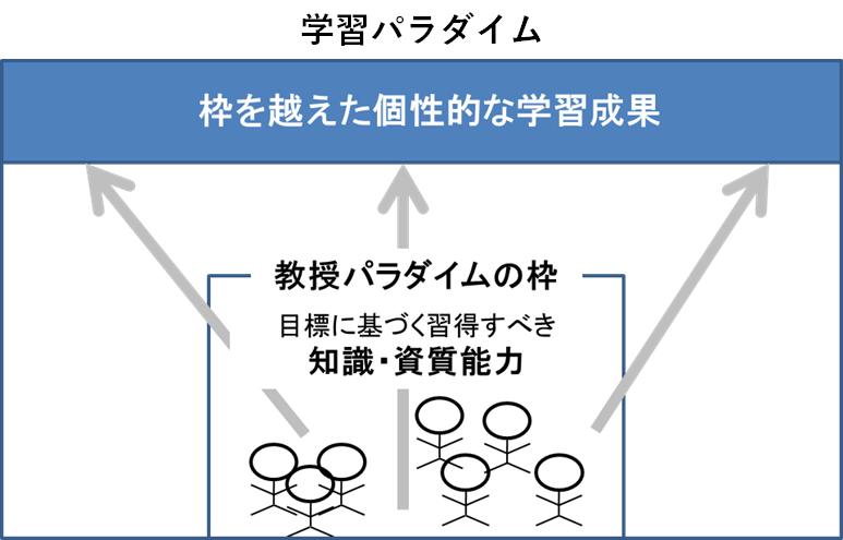学習パラダイムは、教授パラダイムを含み込み、基礎としつつ(全生徒が枠へ到達)、それを越えて生徒個々人の個性的な学習成果を求めるものなのである。