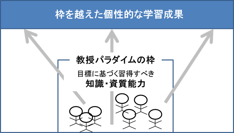学習パラダイムは教授パラダイムに相対する概念として提示されたものであるが、提唱者の一人であるJ. タグ(Tagg, 2003)自身が述べるように、両パラダイムは決して二項対立の関係にあるものではない。教授パラダイムに基づき、教師主導で生徒に知識を伝達する講義の時間はあってよく、その時間は学習パラダイムによって否定されるものではない。タグが「学習パラダイムは活動の場を拡げ、教授パラダイムを越えたところに私たちを移動させるのである」(pp.37-38)と述べるように、学習パラダイムは教授パラダイムを基礎として、教授学習活動を豊かに拡張・発展させるものである。その特徴を示した図式が図表2である。