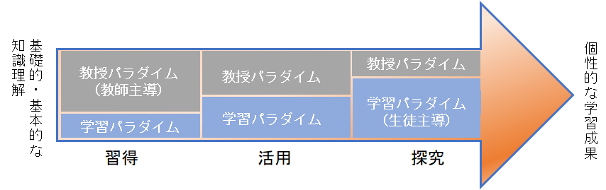 前学習指導要領から習得・活用・探究の学びの過程が求められているが、それも教授学習パラダイムを用いるとその意味がよくわかる。すなわち、一般の教科における習得の授業では、教授パラダイムとしての講義を基礎として、学習パラダイムとしてのアクティブラーニングが補助的に求められる。すなわち「アクティブラーニング型授業」が求められる(注2)。他方で、探究的な学習の授業では、生徒主導の学習活動(学習パラダイム)に大きなウェイトが置かれるものの、他方で教授パラダイムの時間がまったくないわけではない。問いの立て方や情報や資料の収集・整理の仕方などを教師が講義する教授パラダイムの時間は、探究的な学習の授業においてさえ認められるからである。教授パラダイムか学習パラダイムかと二項対立的にとらえるのではなく、習得から活用・探究へと、教授パラダイムのウェイトが下がり、反対に学習パラダイムのウェイトが上がっていくととらえられるべきものである(図表3を参照)。