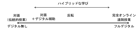 その上で本稿では、Bates(2015)のブレンディッドラーニング論の説明で用いられている図(Figure 9.1.2, p.439)を援用して図表1を作成し、ハイブリッドな学びを次のように定義する。ハイブリッドな学びとは、対面(伝統的授業/デジタル無し)と完全オンライン(遠隔授業/フルデジタル)を両極に置いてスペクトラムとするときの間の学習、すなわち、対面とオンラインによる学習の組み合わせからなる学習のことである。Batesのブレンディッドラーニング論では、「2」で扱う「反転授業(学習)」と「ハイブリッド(な学び)」はともに「ブレンディッドラーニング」の一形態であるが、両者は区別されている。「反転」は伝統的な対面授業に近いブレンディッドラーニングとされており、「ハイブリッド」は完全オンラインに近いブレンディッドラーニングだとされている。本稿は、初等中等教育のものであるが、最近答申された『令和の日本型学校教育答申』(注3)の「ICT の活用や,対面指導と遠隔・オンライン教育とのハイブリッド化」という説明を受けて、「ハイブリッドな学び」が図表1で言うところのスペクトラム全般で捉えられるものとして用いていく。