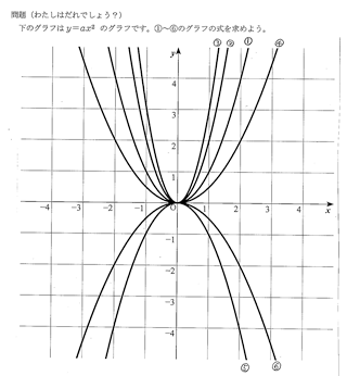 教科書の「関数y=ax²のグラフの特徴」を確認する。例えば、生徒からは「上に開く」という言葉は出にくいので、教科書で言葉を確認する。教科書の特徴のまとめ以上に生徒から出されることもあるので、教科書の特徴に加えていく感じにする。教科書は最低基準として考える。