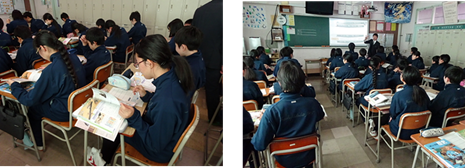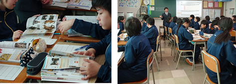 - 視点取りのワークをおこなうなかで、私がもう一つ興味深く注目したのは、図2右の場面である。ワークを中断して、何度か「視点取り」の課題を説明し直す、生徒に何のワークをおこなっているのかを確認させるということをおこなっていた。というのも、さすがに難度が高いワークなので、生徒が調べ学習のなかで個々の歴史事象に焦点化しすぎて、「視点」を取るというワークの目標を見失う状況が散見されたからである。授業では、教師・説明→生徒・ワーク→教師・説明/確認→生徒・ワークが繰り返された。生徒の活動の様子をよく見ているなと感心した。