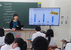 ICT教材はこうしたレッスンの導入部分でも有用である。写真やグラフを見せたり、回収したプリントをスキャンして取り込むことで生徒が書いた英文を手書きの状態で見せたりすることができ、他の生徒への刺激となる。同時に視覚教材によって説明の時間を省き、生徒主体の活動により多くの時間を取ることができる。