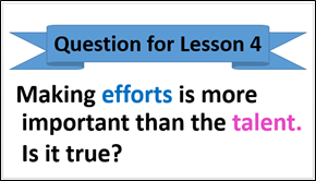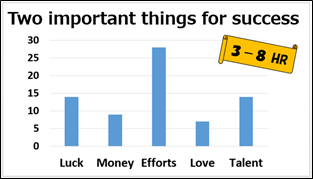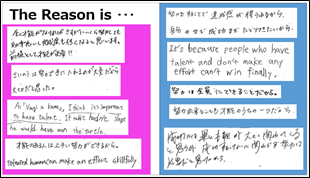 授業の導入部分では、いかに生徒の興味を惹きつけ、自分に身近な話題として認識してもらうかが課題となってくる。コミュニケーション英語ⅢのLesson4では、生徒に事前にアンケートを実施し、その結果を織り交ぜてイントロダクションを行った。「成功するために最も重要なことは努力か、才能か」という答えのない問いを単元を貫く問いに設定し、ペアで意見交換を行ったあと、アンケートの結果をパワーポイントを用いて説明した。アンケート結果の傾向がクラスごとに異なることや、ユニークな意見を取り上げて全体で共有することができ、トピックに対する生徒の自己関連性を高めることができたのではないか。