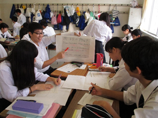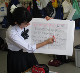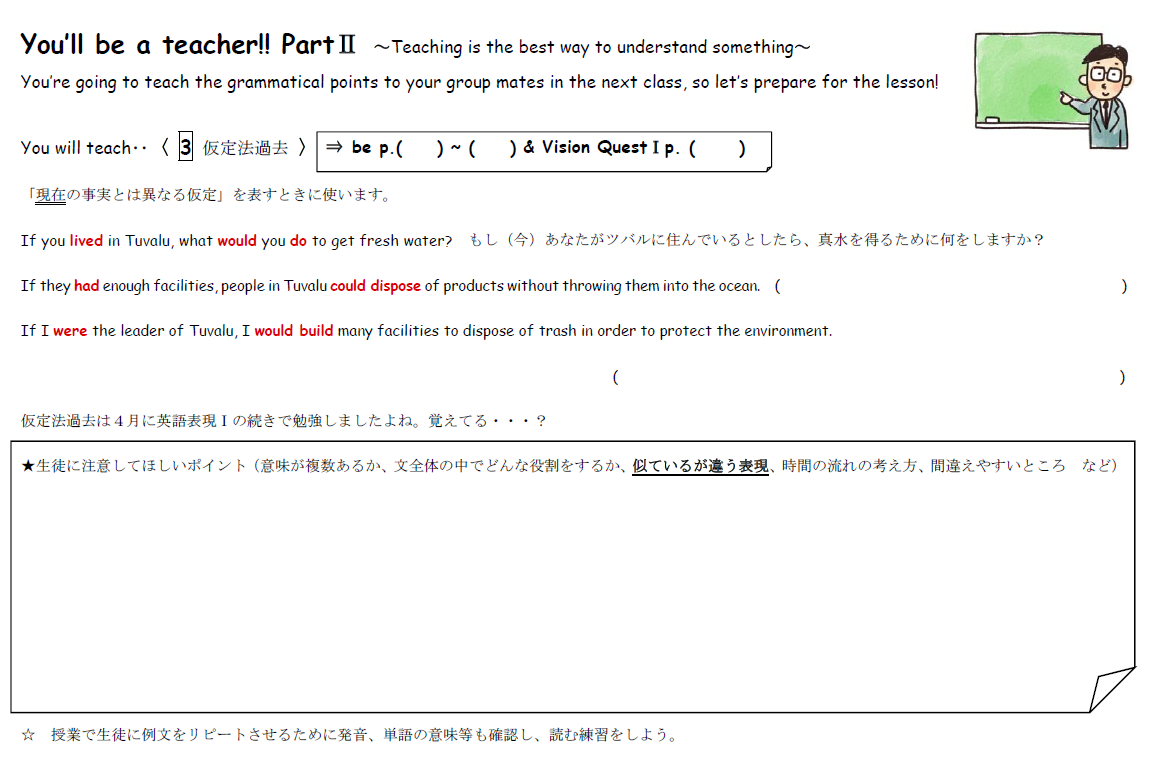 これらの問題を解決するため、グループで互いに先生役と生徒役になり、文法の授業をし合う活動を始めた。