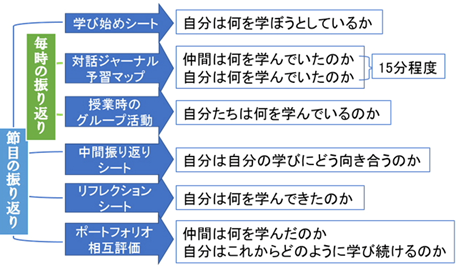 この授業における授業デザインの特徴(工夫)は色々あるが、大きく2つに分けて整理しておく。一つは、振り返りを重視した一連の課題設定である。ひとつ一つの課題については「課題解説」を参照いただくとして、いくつもの課題を繋げることで、学生に自らがこの授業とどのように向き合っているのかを意識させることをねらっている。まず、学び始めシートを使い、振り返りの起点をつくる。次にほぼ毎回の授業で対話ジャーナルを使って振り返る。そして、学び始めに対し、学期途中の状態を点検する中間振り返りを行う。最後に、ポートフォリオを使った学期終わりの振り返りによって、自己評価・相互評価を促す。