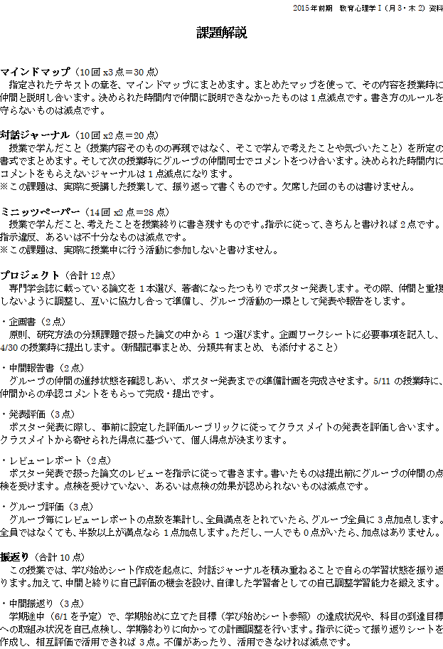 教育心理学Iは、教育学部教育学科の2年次前期に配当されている選択必修科目である。2014年までは(前任者が)、2単位科目として週1回90分の授業を15週行っていた。それを2014年度のカリキュラム改訂に際し、週2回90分の授業を15週(計30回)行う3単位科目に改めた。これにはいくつかの理由があるが、アクティブラーニングを行う時間的余裕を確保することも、そのうちの大きな理由であった。