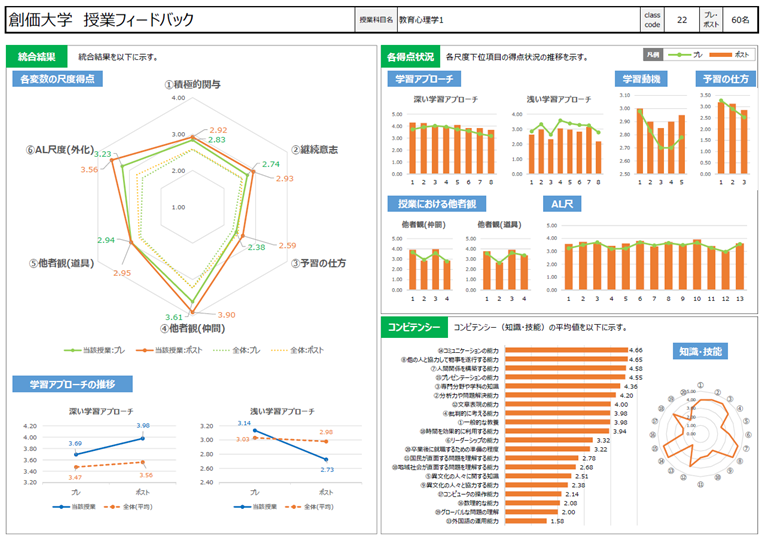 調査結果によると学期のはじめと終わりでは、様々なアクティブラーニング指標が有意に上昇している。授業におけるアクティブラーニングが有効に機能していたと思われる。学生たちが残した振り返りのコメントや授業アンケートからも、大半の学生には良い学習経験となったことが伺える。