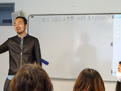 生徒が予想し始めたところで、生徒への本時のResearch Questionをホワイトボードに書きます。シンプルに「なぜUSAは世界一の経済大国なの?」です(図表1)。そして、「これからの授業で、この答えが出せるようにみんなで協力して考えてみよう。そして最終的にはそれぞれが結論を言えるようになろう」とこの授業の目標を提示します。
