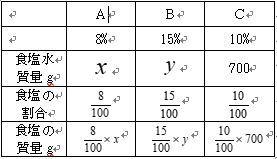 濃度(%)=食塩の質量÷全体の質量×100 ※全体の質量=水+食塩の質量