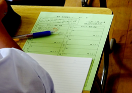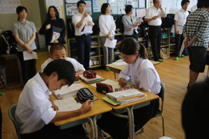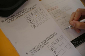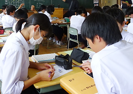 さて、濃度や速度などの割合の問題は、単位やその求め方に混乱を生じる生徒も多く、1年生時の文字式や方程式の時より、 表を書かせ、その表をきちんと完成させることで式を考え、解答を導き出せるように指導をしている。今回の食塩の濃度の問題についても、表を用いて式を立てることを指導し、 表を書くことから学習を進めた。表を書いて式を求めることを示した後、個々に解答を求めさせた。分数の計算に戸惑う生徒もいたが、個別学習でありながらも、周りの生徒との教え合いで、 ほとんどの生徒が解を導き出すことができた。