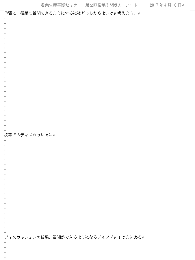 予習では、1回だけニュースを聞いて、メモし、このメモをみて、ニュースの要点をまとめるということからはじめた。1回だけでメモを作り、これをもとに報告するということは実社会ではよくあることだ。ここでノートテークについて意識させる(ノートし終わるまで存在し続ける板書がいいのだといくら学生が要望したって、1回きりで消えてしまう音声や画像だけから報告書を作るためのノートを作れなきゃ困る)。そのあと、大学と高校の授業の違い、どうしたら質問できるようになるのかを尋ねた。そして、模擬授業をノートさせて、ノートのとり方を考えさせて、予習は終わり。