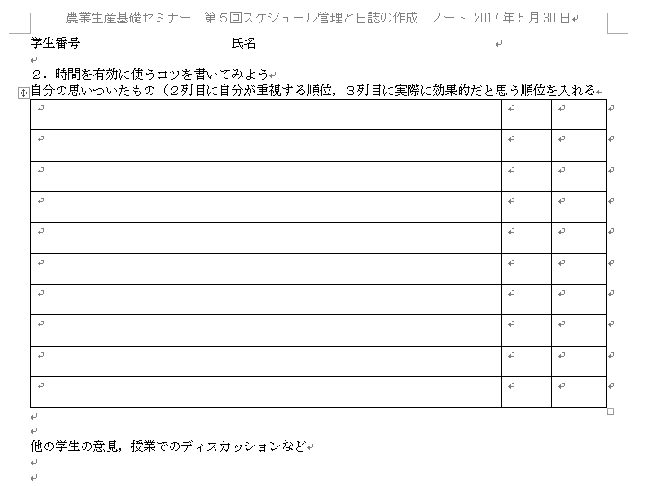 スケジュール管理について学生同士で議論させた。意外と今でも多いのが手帳だ。ネットスケジューラーの便利さも説明し、スケジュール管理は個人的なもので人それぞれなので、ネットスケジューラーが向く学生もいるので、試したらよいだろうと説明した。学生によっては、「記憶するだけ」、「手に書く」、「メモする」、「手帳」、「スマホのスケジュール管理ソフト」、「ネットのスケジューラー」とさまざまであり学生同士の議論はそれなりに活発になった。