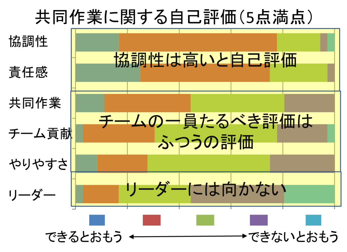 授業後の学生の感想の例をあげる。「多くの学生は自分はリーダーには向いていないが、協調性は高いと自己評価している。この評価をみるとしっかりしたリーダーがいればグループ活動はうまくいくと考えているようにも取れるが、実際にチームプレーで大事なのは個人個人がやるべき時にやるべきことをするということだと分かった。自分はできないからと謙虚ぶるのではなく、自分の能力を正確に知り、できることを確実にすることがチームへの貢献につながると感じた。また、チームの目的をしっかり把握することも重要である。」