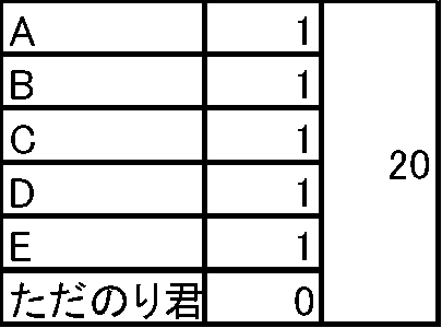 協力すると一人一人でできることよりも大きな成果が得られる。ここで5人(AからE君)がいて、一人一人では1ずつ、合計では5しかできないところ、協力して20できたとする(以下の図表)。ここへただのり君が来て、ただのり君はいただけで何もしないのに、「ぼくがいたおかげで20-5=15も成果が増えた。増えた15はみなぼくのおかげだから、当然ぼくのものだけど10だけもらって5は君たちにあげるよ ぼくは気前いいのだ」といったら・・・・どうする? 協力なんてばからしい・・・