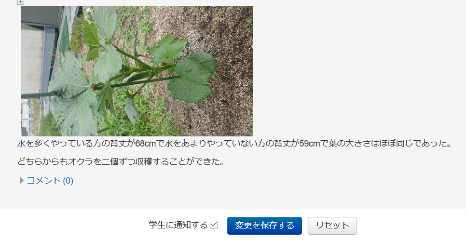 学生一人一人に野菜を使って、何らかのテーマを考えて調査させた。水をやるのとやらないのとでトマトの甘みがどう変わるかなど、簡単なテーマを考えさせた。毎週、Moodle上に観察記録を提出させた。継続的な観察の重要性を教える効果を狙った。