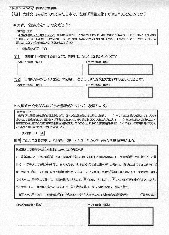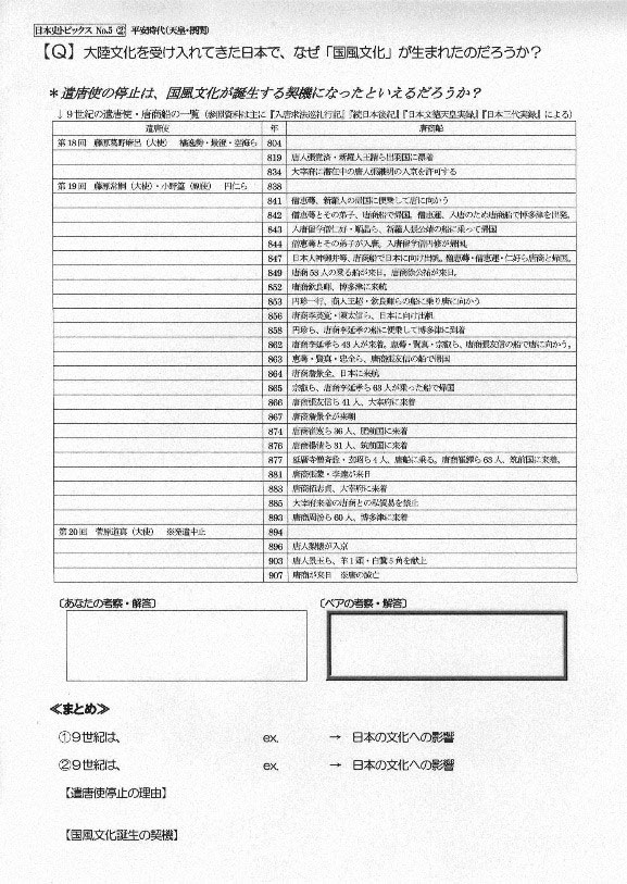生徒が容易に結びつけてしまいがちな「遣唐使停止」と「国風文化誕生」とが、原因・結果という単純な関係ではないという点は、授業最後の生徒の様子から十分に伝えられたと感じた。過去の教科書の記述が近年になって修正されてきた点も、教科書を「すべて正しい」と思い込んでしまいがちな生徒にとっては新鮮な話であったようである。