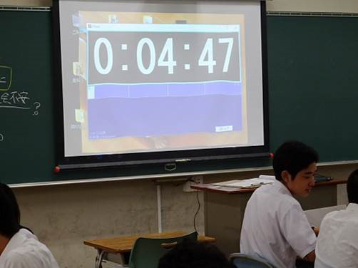 内容によって異なるが、基本的には5分。生徒の様子を見て間に合っていない場合は、3分追加などおこなう。かなり短い設定時間であるが、短いくらいの方が生徒の集中力は保てる。無駄のない議論を交わしてもらうがための時間設定をしている。