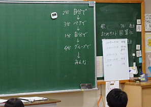 そこで、ペアやグループでの交流を多く取り入れることにした。交流では、短時間で、多くの児童が一斉に発言できる。しかも具体的に聞いてもらう相手が目の前にいることで、