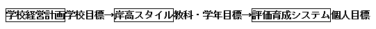 教員は、この順に学校組織の目標を個人の目標にまで落し込むことになる。それぞれの目標を達成できるよう自分の授業等を実践していくと、逆ルートで学校目標である生徒像に到達する。同じ方向にベクトルが合わされ、個人の力が教科の力に、そして学校全体の大きな力として合流していくようマネジメントしている。