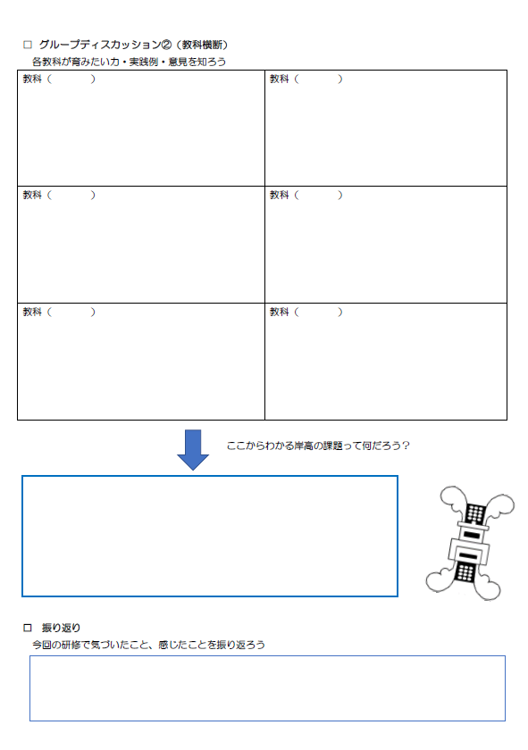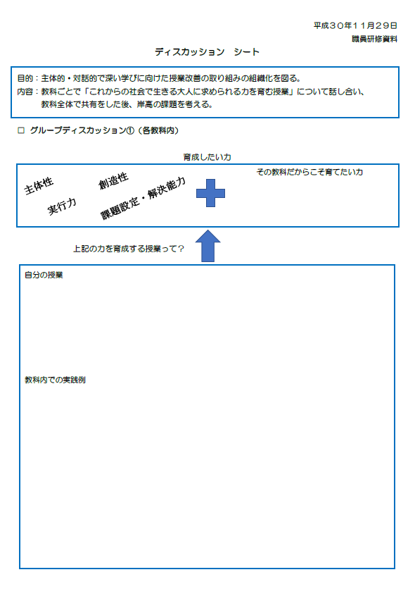 (研修内容)教科ごとで「これからの社会で生きる大人に求められる力を育む授業」について話し合う。その力を実践事例を交えてグループ討議を行い全体で共有し、学校の課題を考える。