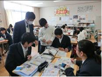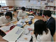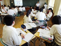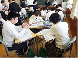 ①の話し合いは、予習を丹念にやってきた生徒が多く、活発に自分が調べてきたことを班員に伝える様子が見られた。聞く側も、普段から「傾聴」の姿勢をとることを重点的に指導してきたため、うなずきながらメモを取って聞くことができていた。
