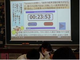 授業の終わりでは毎回、欧文印刷株式会社から出されている「ヌーボード」というホワイトボードがノート状にされたものを利用して紙芝居プレゼンテーション(KP法)形式で、他班に自分のグループの意見を発表させている。一斉授業のクラスでは3つの班を1グループにして発表をしている。(公開授業と前後して本校でもiPad(ロイロノート)が導入されたが、生徒たちの中では「ヌーボード」の方がいいという声も聞かれる。「まなボード」とあわせてどれがふさわしいかは授業環境や学習デザイン、発表方法により異なってくるのかもしれない。)
