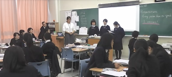 必ずパートごとにサマリーやリテイリングを行い、教科書の表現を実際に使い学んだことを表現させる時間を設けている。高校2年生になり、これらの活動を約一年間ほぼ毎日行っているが、英語を聞いたり、読んだりしながら、英語でメモを取る力や話す力がついた。実際に今回の授業においても全てディスカッションは日本語で行ったが、メモは全員英語でとれていた。本授業は、最後に英語でのプレゼンテーションを行い、各グループの意見を交換した。
