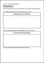 新たなワークシートを使い、Aの栗林中将の使命とBの栗林中将の家族への思いを比べて気づいたことを書く。またB栗林中将の家族への思いとC兵士たちの家族への思いを比較させた上で本時の授業の問い”Do you agree with Kuribayashi’s decision?”についてグループの意見をまとめる。