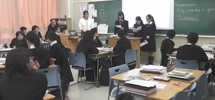 英語の雰囲気作りとして、必ず歌を歌っている。生徒のリクエストを毎回募集し、選曲している。基本的に、毎時間小テストを行うが、小テストのない日などは、授業が始まる前に歌を流すことで雰囲気を和らげることができる。また、歌を歌った後は、英語を音読する声も大きくなる。