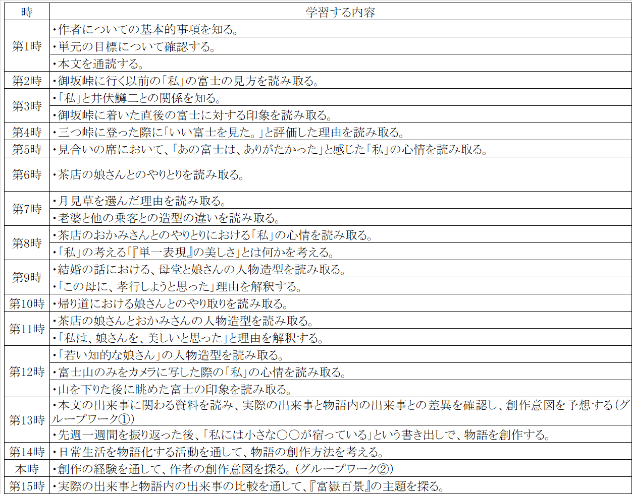 ③ 自身の活動をもとにキーワードにさせ、全体で共有することで、物語を分析するうえでの共通の用語を作り、『富嶽百景』における作者の工夫にもその用語を使って説明させることがねらいである。