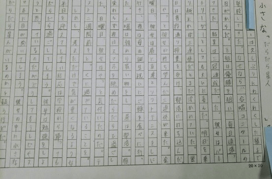 ④作者の工夫に着目させるために、「この一週間の自分に何かが宿り、そのものに動かされていたとしたら自分には何が宿っていただろうか。それをもとに『ちいさな○○』というタイトルで物語を創作せよ。」という課題を与えた。