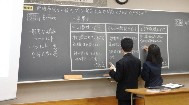 複雑化する現在の国際社会では、世界の諸地域における文化の多様性と複合性について、様々な条件をもとにして多角的に考察する力が必要である。そのため、知識量よりも、知識を活用して思考する力、思考したことを他者に対して的確に表現できる力を身に付けさせることを目標として指導している。そしてそれらの力をもとにして、現代社会の諸課題を的確に分析し、未来を主体的に創造していく力を育んでいきたい。