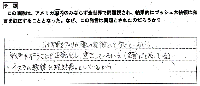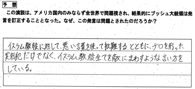 【予想】・ワークシートでの予習をもとに、ブッシュ演説が世界中から批判された理由を予想し、発表する。