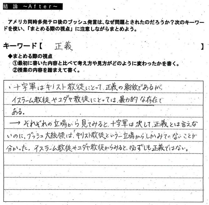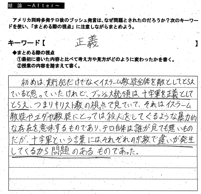 ◆想定される生徒の考え ・アメリカにキリスト教徒ではない人もいるから。 ・証拠もなく戦争をすると宣言しているようだから。 | |