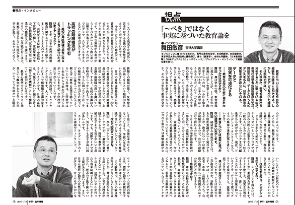 舞田敏彦(杏林大学講師)「「~べき」ではなく事実に基づいた教育論を」『学研・進学情報』2017.3