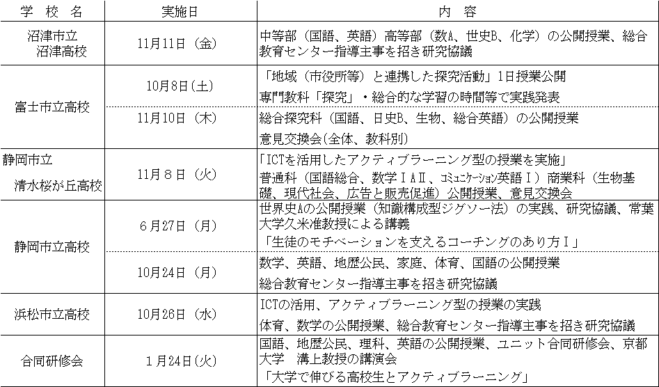 沼津市立沼津高等学校から、ユニット(議論・検討する集団)によるアクティブラーニング型授業の実践について提案があり、他の都市立4校もユニットをつくり、都市立5校が合同で研修を実施することになった。各校において5名程度の教員がユニットを結成し、授業案の作成・授業公開・評価の検討等を実施し、授業研修の中心的な役割を果たしている。