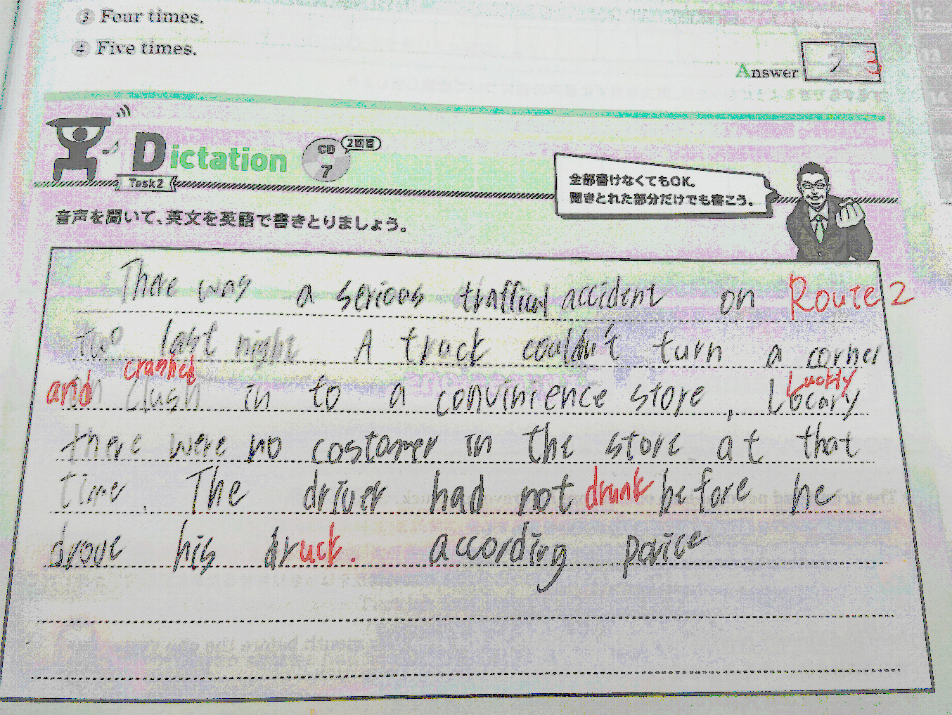 目 的 聞き取れなかった箇所やつづりの分からなかった単語をチェックします。ここでは聞き取れなかったのか、聞き取れたのに書き間違えたかの確認をします。つづりを間違った単語は後で何回も練習し、覚えます。