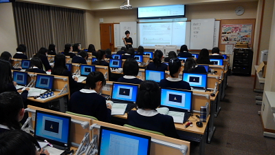 授業では1人1台パソコンとマイク付きヘッドフォンを使います。ディクテーションや録音は各自がパソコンを使って行うので、自分のペースで取り組むことができます。特にディクテーションは一度に聞き取れる量に個人差があるので、教室で一斉にやるとどうしても早々に諦めてしまう生徒が出てしまいます。その点この方法では全員積極的に取り組めています。
