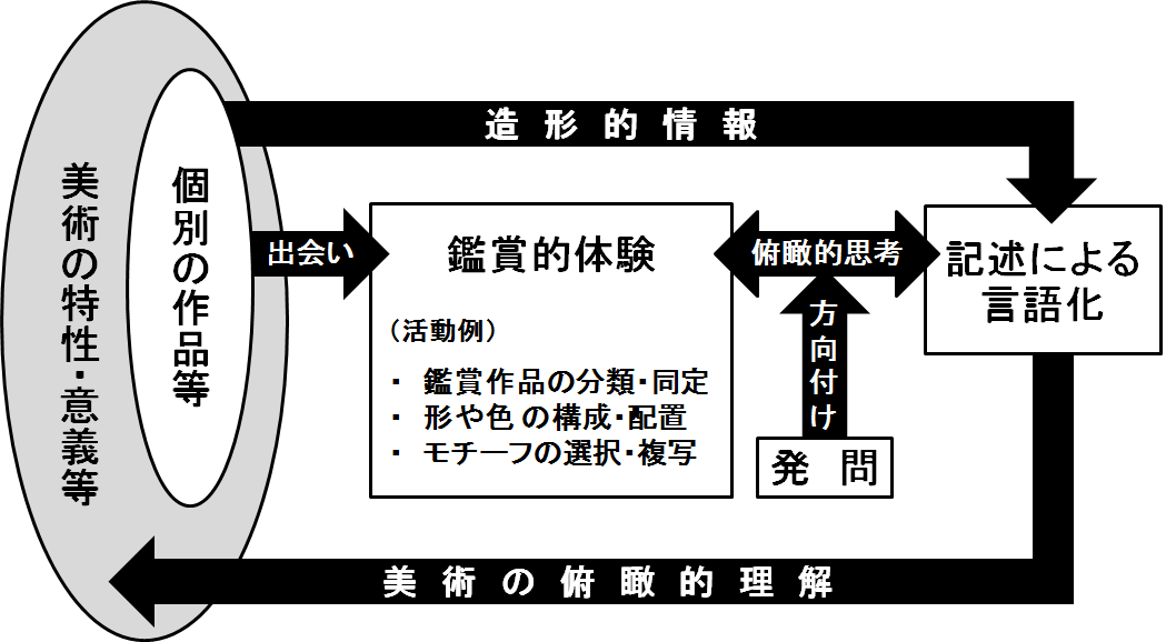 美術科の授業においてアクティブラーニングを導入するにあたり,本授業実践では「鑑賞的体験」という学習過程を設定することとした。「鑑賞的体験」とは,学習者が身体的活動や追体験的活動を通して,作品の主題や表現様式等とかかわり,自身の認識や感覚等を持つことが出来る体験であると位置づける。また,「美術の俯瞰的理解」とは,作品理解にとどまらない美術の特性・意義に関する本質的理解である立場をとる。図1において,「鑑賞的体験」を通して得た感覚等を記述による言語化を行うことによって,「美術の俯瞰的理解」を促し,美術の特性や意義を思考するという主体的な学びの過程をアクティブラーニングと位置づける。本実践においては,「鑑賞的体験」に関する自由な感想を学習者に記述させるスタイルではなく,高い指導性をもって学習者の思考を'美術の俯瞰'へとガイドするには意図のある発問を設定することが有効であると考えた。発問によって俯瞰的な視点を与えることを通して,学習者は「鑑賞的体験」からどのような美術の特性を読み取ることが出来たのかという意味づけを行う契機となる。その思考の内容を記述することで,学習者は主体的な学びとしての「美術の俯瞰的理解」に到達することができると考えた。